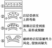 解析 第13题,根据岩层的弯曲状态可以判断,岩层受水平挤压力作用,a处为背斜,
