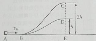 (10分)如图,ABC和ABD为两个光滑固定轨道,A、B、E在同一水平面,C、D、E在同一竖直线上,D点距水平面的高度h,C点高度为2h,一滑块从A点以初速度