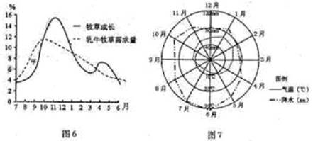 图6为某地牧草成长与乳牛草料需求关系图,图7为该地气候资料。完成25-26题