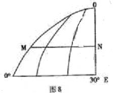 图8为某日光照示意图。M、N两点在同一纬线上,OM是晨昏线的一段,O为晨昏线与玮线的切点,M点正值日落,且OM所在晨昏线平面与赤道平面夹角为70°。完成27-28题。