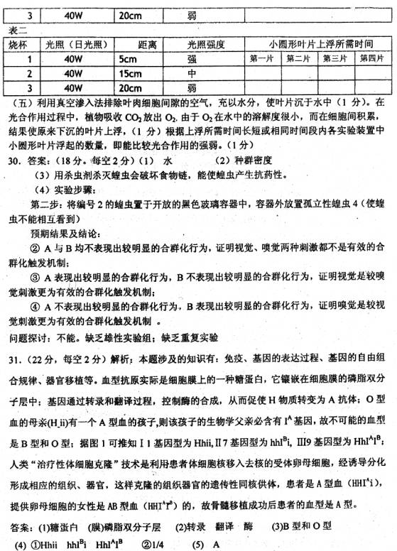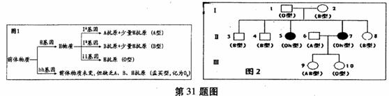 31.(22分)现已查明支配人类ABO血型中的A、B抗原基(IA基因、IB基因)定位在第9号染色体上,H抗原的基因(H基因)定位在第19号染色体上。ABO血型系统的形成与有关基因的关系如下图1所示。1952年在印度孟买发现一个血型奇特的家系,如下图2所示。请据此分析回答有关问题: