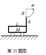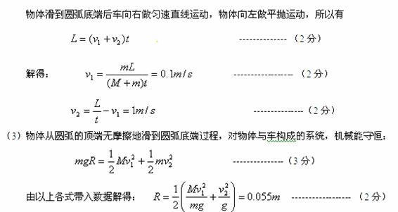 (18分)如图所示,在小车的右端高h=0.20m的支架上固定着一个半径为R的1/4圆弧光滑导轨,一质量为m = 0.2kg的物体从圆弧的顶端无摩擦地滑下,离开圆弧后刚好落到车的左端边沿,车与支架的总质量M=2kg,车身长L=0.22m,车与水平地面间的摩擦不计,重力加速度g =10m/s2,求: