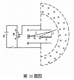 36. (18分)如图14所示,两平行金属板A、B长度l=0.8m,间距d=0.6m.直流电源E能提供的最大电压为9×105V,位于极板左侧中央的粒子源可以沿水平方向向右连续发射比荷为=