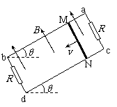 20.如图所示,相距为L的平行金属导轨ab、cd与水平面成θ角放置,导轨与阻值均为R的两定值电阻R1、R2相连,磁感应强度为B的匀强磁场垂直穿过导轨平面。有一质量为m、阻值也为R的导体棒MN,以速度v沿导轨匀速下滑,它与导轨之间的动摩擦因数为μ,忽略感应电流之间的相互作用,则( )