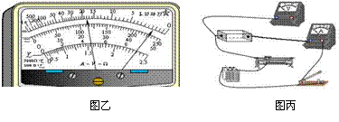 ⑴他先后用多用电表欧姆档的“×1k”、“×100”两个档位粗测水样的电阻值时,表盘上指针如图乙中所示,则所测水样的电阻约为 Ω.