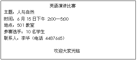 I'm Li Hua, a chairman of the Student Union of Yucai Middle School, which is close to your university. I'm writing to invite you to be a judge at our English speech contest to be held in our school on June 15. It will start at 2:00 pm in Room 501 and last for about three hours. Ten students will deliver their speeches on the given topic “Man and Nature”. We hope that you will accept our invitation if it is convenient for you. Please call me at 44876655 if you have any questions.
