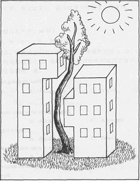 In the picture, between two closely-located buildings grows a big tree. Unlike most trees, this one bends in the middle, struggling all the way up to get more sunshine. The picture reminds me of those who succeed in unfavorable condition. Faced with difficulties, they never give up but try their best to find a way out. Life can be hard. But if we have the courage and determination, we will finally get the sunshine we want as the tree in the picture does。
