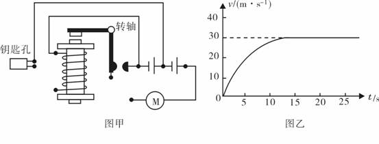 说明:当钥匙插入仪表板上的钥匙孔并转动(相当于闭合开关),电动机工作,启动轿车;电磁铁的工作电压小于电动机的工作电压.