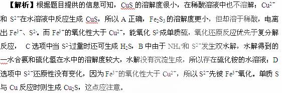 [例1]金属离子和硫离子在水溶液中的反应比较复杂,其产物与离子的水解、金属硫化物的溶解度、离子氧化性或还原性等因素有关。资料表明,CuS的溶解度很小,在稀酸溶液中也不溶解;Fe2S3的溶解度更小,但却溶于稀酸。下列有关说法正确的是