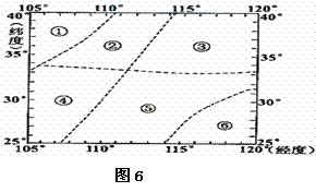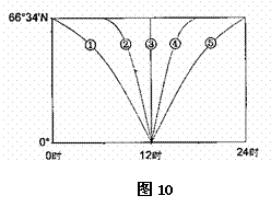 图10中①-⑤为0°-66°34′N之间不同日期的昼长分布曲线示意图。读图完成29-30题。