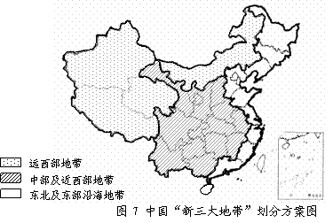 随着区域经济社会的快速发展,有学者提出中国宏观区域经济的“新三大地带”的划分方案,分为东北及东部沿海地带、中部及近西部地带、远西部地带。读图7,完成19-21题。