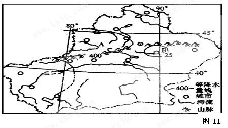 (2)图中A地年降水量比B地 ,说明造成两地降水差异的原因。(5分)