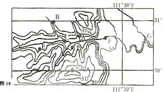 (5)图示区域内拟建一大型水利工程,设计最高蓄水水位为150米,在图中用“||”标出最佳位置,推算出需要移民的数量为 万。(2分)