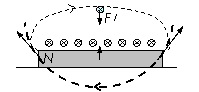 [例3] 条形磁铁放在粗糙水平面上,正中的正上方有一导线,通有图示方向的电流后,磁铁对水平面的压力将会___(增大、减小还是不变?)。水平面对磁铁的摩擦力大小为___。