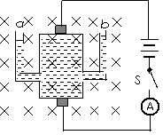 [例10]如图所示是一个可以用来测量磁感应强度的装置:一长方体绝缘容器内部高为L,厚为d,左右两管等高处装有两根完全相同的开口向上的管子a、b,上、下两侧装有电极C(正极)和D(负极)并经开关S与电源连接,容器中注满能导电的液体,液体的密度为ρ;将容器置于一匀强磁场中,磁场方向垂直纸面向里,当开关断开时,竖直管子a、b中的液面高度相同,开关S闭合后,a、b管中液面将出现高度差。若当开关S闭合后,a、b管中液面将出现高度差为h,电路中电流表的读数为I,求磁感应强度B的大小。