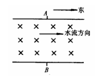 如图所示为北半球一条自西向东的河流,河两岸沿南北方向的A、B两点相距为d.若测出河水流速为v,A、B两点的电势差为U,即能测出此地的磁感应强度的垂直分量B⊥.