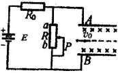 如图所示,电源电动势为E,内阻忽略不计,滑动变阻器的滑片P置于中点:两平行极板间有垂直纸面的匀强磁场,一带正电的粒子以速度