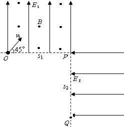 如图所示,竖直平面上有相互垂直的匀强电场和匀强磁场,电场强度E1=2500N/C,方向竖直向上;磁感应强度B=103T,方向垂直纸面向外;有一质量m=1×10-2kg、电荷量q=4×10-5C的带正电小球自O点沿与水平线成45°以v0=4m/s的速度射入复合场中,之后小球恰好从P点进入电场强度E2=2500N/C,方向水平向左的第二个匀强电场中.不计空气阻力,g取10m/s2.求: