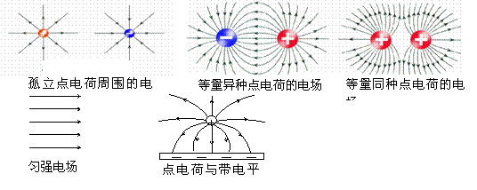 ⑷ 每道题都应该画出示意图,抓住电场线这个关键。(电场线能表示电场强度的大小和方向,能表示电势降低的方向。有了这个直观的示意图,可以很方便地判定点电荷在电场中受力、做功、电势能变化等情况。)