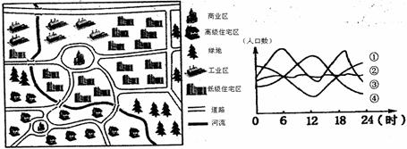 读“某城市内部空间结构示意图”(左图)和“某城市四地区人口数量一日变化曲线图”(右图),回答23-24题。