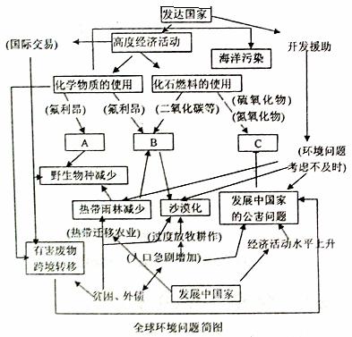 全球环境问题相互联系和相互制约,使人类面临的各种环境问题构成了一个复杂的环境问题群,上图中A、B、C代表的环境问题在整个环境问题群中占有极其重要的位置,因而被认为是三大全球性环境问题。读图回答下列问题。
