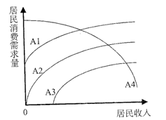 消费是我们日常生活中不可缺少的部分,居民收入直接影响居民消费需求。在图中,合理表示居民收入与居民消费需求量的关系的是