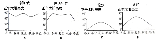 解析:本题考查的是正午太阳高度的年变化规律,着眼点为纬度判断。新加坡位于赤道附近,春分和秋分时正午太阳高度最大,接近90度,故A错。巴西利亚位于南纬15度,一年有两次最大值90度,时间位于秋分到冬至之间和冬至到春分之间,夏至日为最小值,故B错。伦敦位于北回归线以北地区,冬至正午太阳高度最小,但不能为零,因为冬至日时北极圈正好出现极夜,正午太阳高度正好为0度。纽约位于北回归线以北地区,冬至正午太阳高度最小,夏至日最大,故D对。