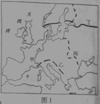 图1为欧洲部分地区略图,图中四条线是重要的地理界线。完成1~2题。