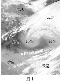 图1是2010年3月中旬发生在我国的沙尘暴的一幅遥感影像。图中色调白浅云层、被卷到控制的沙尘和陆地表面。读图1,完成1-3题。