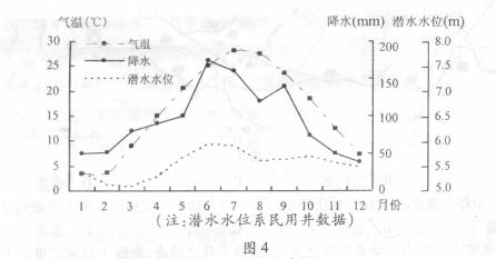 图4是某地气温、降水、潜水水位(潜水面海拔)年内变化图。读图回答8-9题。