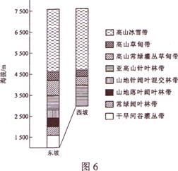 图6示意我国某山的东坡和西坡的垂直带谱。读图6,完成16-18题。