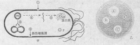 几百种。甲图简要表示不同种类的抗生素(①~⑤)对细菌的作用部位或作用原理。