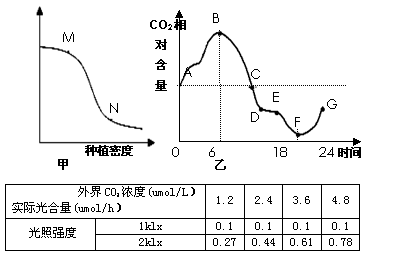 34、(16分)某科研组对密闭大棚内番茄的光合作用与呼吸作用进行了研究。绘出了单株番茄光合作用强度与种植密度的关系图(甲)和M点对应情况下的大棚内一天中的CO2含量的变化图(乙)。用红外测量仪在恒温不同光照下测得右表数据(实际光合量用葡萄糖表示)和植株呼吸作用释放CO2为0.6umol/h。请回答: