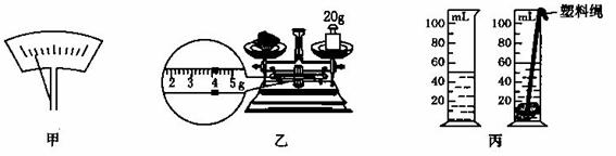 20、小明利用天平、绳子、量筒和水测量某固体的密度,如图所示。