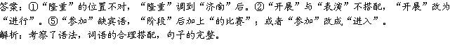 ①中华人民共和国第十一届运动会将于2009年10月隆重在山东济南开幕。②开幕式上将开展大型文体表演。③十一全运会提出了“和谐中国全民全运”的主题口号。④本届全运会吉祥物为“泰山童子”。⑤本届运动会共有46个代表团的1000余名运动员参加决赛阶段。⑥本届全运会适逢共和国成立60周年、全运会创办50周年,是2008年北京奥运会后对我国竞技体育和群众体育的大检阅,是一次具有特殊重大意义的体育盛会。