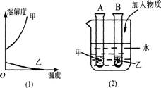 31. 右图(1)表示甲、乙两种固体的溶解度随温度变化的情况;右图(2)A、B试管中分别盛有甲、乙两种固体的饱和溶液,试管底部均有未溶解的固体。向烧杯中加入一种物质,发现A试管中固体增多.B试管中固体减少,则加入的物质是