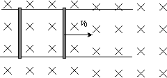 如图所示,在匀强磁场区域内与B垂直的平面中有两根足够长的固定金属平行导轨,在它们上面横放两根平行导体棒构成矩形回路,长度为L,质量为m,电阻为R,回路部分导轨电阻可忽略,棒与导轨无摩擦,不计重力和电磁辐射,且开始时图中左侧导体棒静止,右侧导体棒具有向右的初速v0,试求两棒之间距离增长量x的上限。