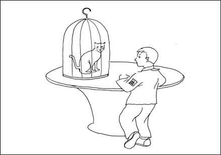 As we can see in the picture, a student, Xiao Ming stands at a table staring at a birdcage with a cat in it. He looks puzzled. How can the cat be kept in the birdcage when it should feel free to play inside or outside the house? It is certainly feeling uneasy, unhappy and uncomfortable. Its owner should have thought about its nature --- it loves freedom. The picture attempts to convey a message that whether children or small animals, they should have their own place suited to their nature. Unnecessary limitation should be removed. Only in this way can they have healthy development both physically and mentally.