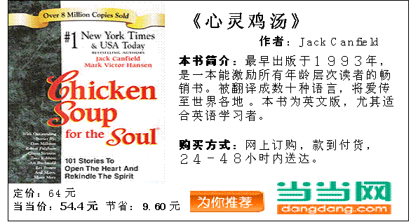 下面是当当网上小说《心灵鸡汤》的广告介绍。假如你是李华,请用英语给你的笔友王海写一封信,建议他上网购买此书。内容须包括推介理由和购买方法等![]()