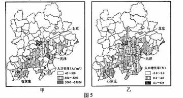图5甲、乙分别示意京津冀都市圈2000年人口密度分布和人口增长率。完成9-10题。