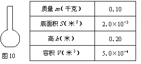 图10所示平底烧瓶的质量、底面积等各项参数如下表所示。若在烧瓶中装满水后,将它放在水平桌面上,求: