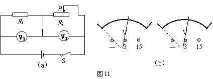 ③ 若可改变电表的量程,移动滑动变阻器的滑片P,使两电表的指针偏离零刻度线的角度恰好相等,如图11(b)所示,求:此时变阻器连入电路的阻值R2′。