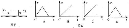 3.如图甲所示,放在光滑面上的木块受到两个水平力F1与F2的作用而静止不动,现保持Fl大小和方向不变,F2方向不变,使F2随时间均匀减小到零,再均匀增加到原来的大小,在这个过程中,能正确描述木块运动情况的图象是图乙中的 ( )