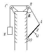 距离为H。某一时刻,当绳的BA段与OB之间的夹角为α时,杆的角速度为ω,求此时物块M的速率