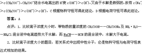 解析:NaOH与CH3COOH恰好完全反应生成CH3COONa,由于CH3COO-的水解,显然c(Na+)![]()