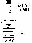 如图5-6所示,取长10cm,宽1.5cm的铝箔,用细线系好。在其表面涂一层硝酸汞的药液,立即用滤纸将铝箔擦干,迅速放入粗玻璃管中,悬于玻璃管上部,立即插入盛水的小烧杯中,塞上塞子,静置观察。![]()