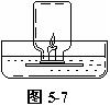 如图5-7所示,在水槽中盛适量的稀氢氧化钠溶液,并滴入2-3滴酚酞试液,在小木片上固定一只短蜡烛(普通蜡烛1cm,生日蜡烛2-3cm),用火柴点燃蜡烛。![]()