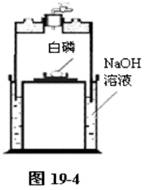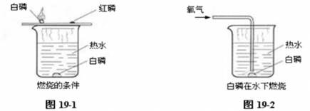 方案⑴:在250 mL的烧杯中放入一小块白磷,并注入200 mL的热水。在烧杯上盖一片薄铜片,铜片一端放一小块已用滤纸吸去表面水分的白磷,另一端放一小堆干燥的红磷。如图19-1。过一会,铜片上的白磷因满足燃烧的条件而燃烧,热水中的白磷因没有跟氧气接触而不能燃烧,铜片上的红磷因没有达到着火点而不能燃烧(白磷的着火点约40℃,红磷的着火点约240℃)。说明燃烧需要同时满足三个条件:①物质具有可燃性;②温度达到可燃物的着火点;③可燃物跟氧气接触。如果用双连球向水中白磷周围通入氧气,白磷在热水中也能燃烧。如图19-2。如果将铜片上的红磷放在酒精灯上加热,使红磷的温度继续升高,红磷就可以燃烧了。