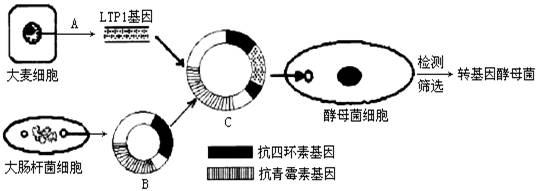 (5)此操作中可以用分别含有青霉素、四环素的两种选择培养基进行筛选,则有C进入的酵母菌在选择培养基上的生长情况是__________________________________________。(2分)