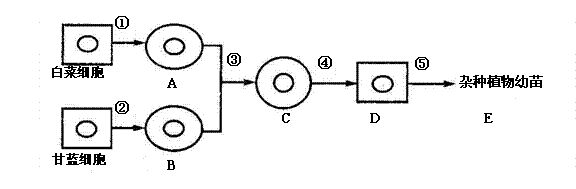 ⑵ A、B表示原生质体融合,最终杂种细胞D生成的标志是形成________________;再由D形成E的过程所依据的原理是__________________________,